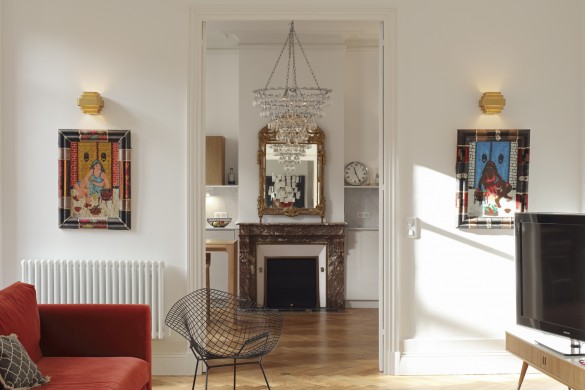 Le projet développe une rénovation complète de l’ensemble. Il associe l’empreinte de l’ancien aux exigences de la vie moderne. Pas de faux plafond, toutes les hauteurs sont conservées pour mieux mettre en valeur moulures et frises anciennes. Une cuisine au design épuré vient s’inscrire dans l’enfilade des trois pièces de réception. Entre cheminée de marbre et miroir XIXe, la modernité s’immisce sans rien forcer, ni détruire des lignes originelles.