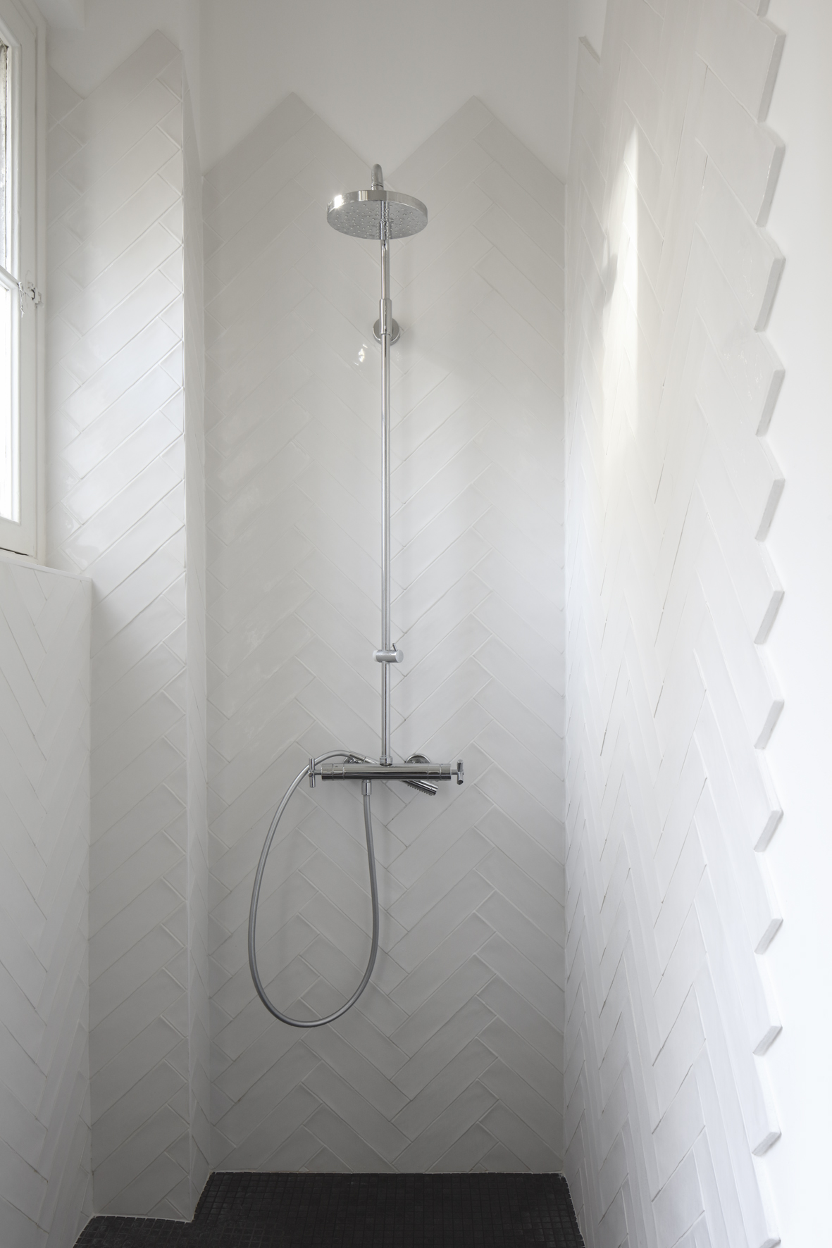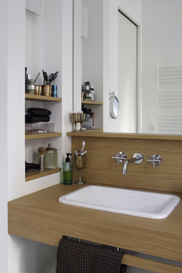 L’ensemble est redistribué autour de deux puits de jour. À l’arrière de l’appartement, on dessine un vaste espace parental avec dressing et salle de bain. De nouvelles salles d’eau sont créées pour les deux autres chambres, tout comme une buanderie et un espace de rangement.
